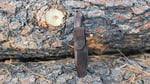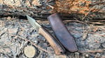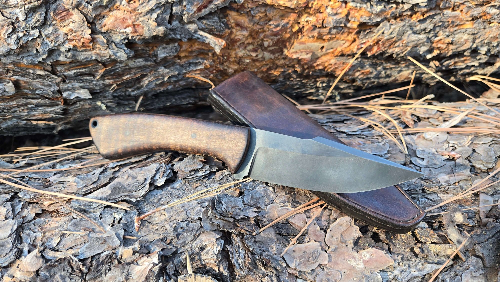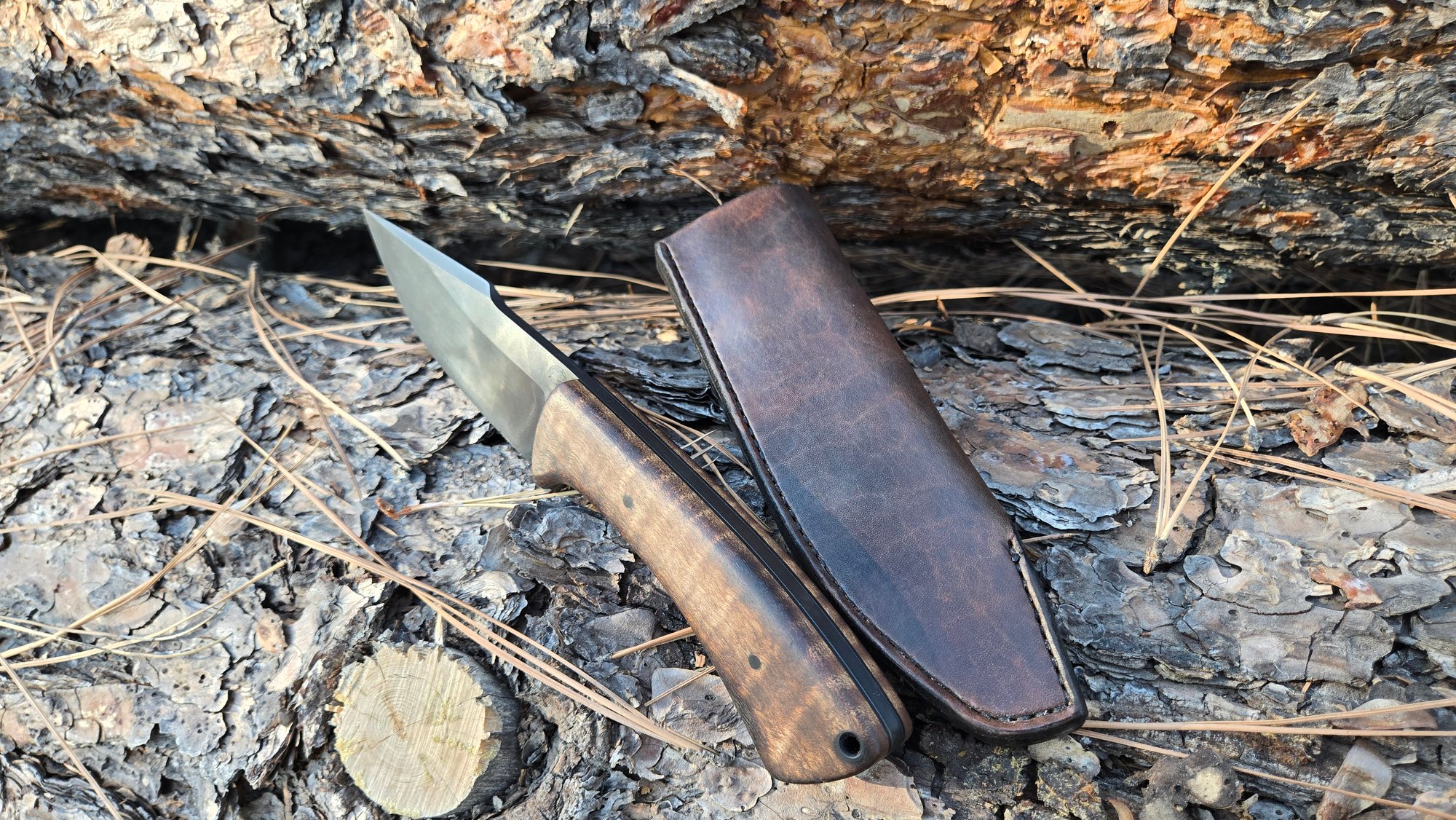 Full tang Harpoon Point with a 4" blade of 3/16" 80CrV2 with a black oxide finish and flame darkened maple scales. Includes a leather sheath.