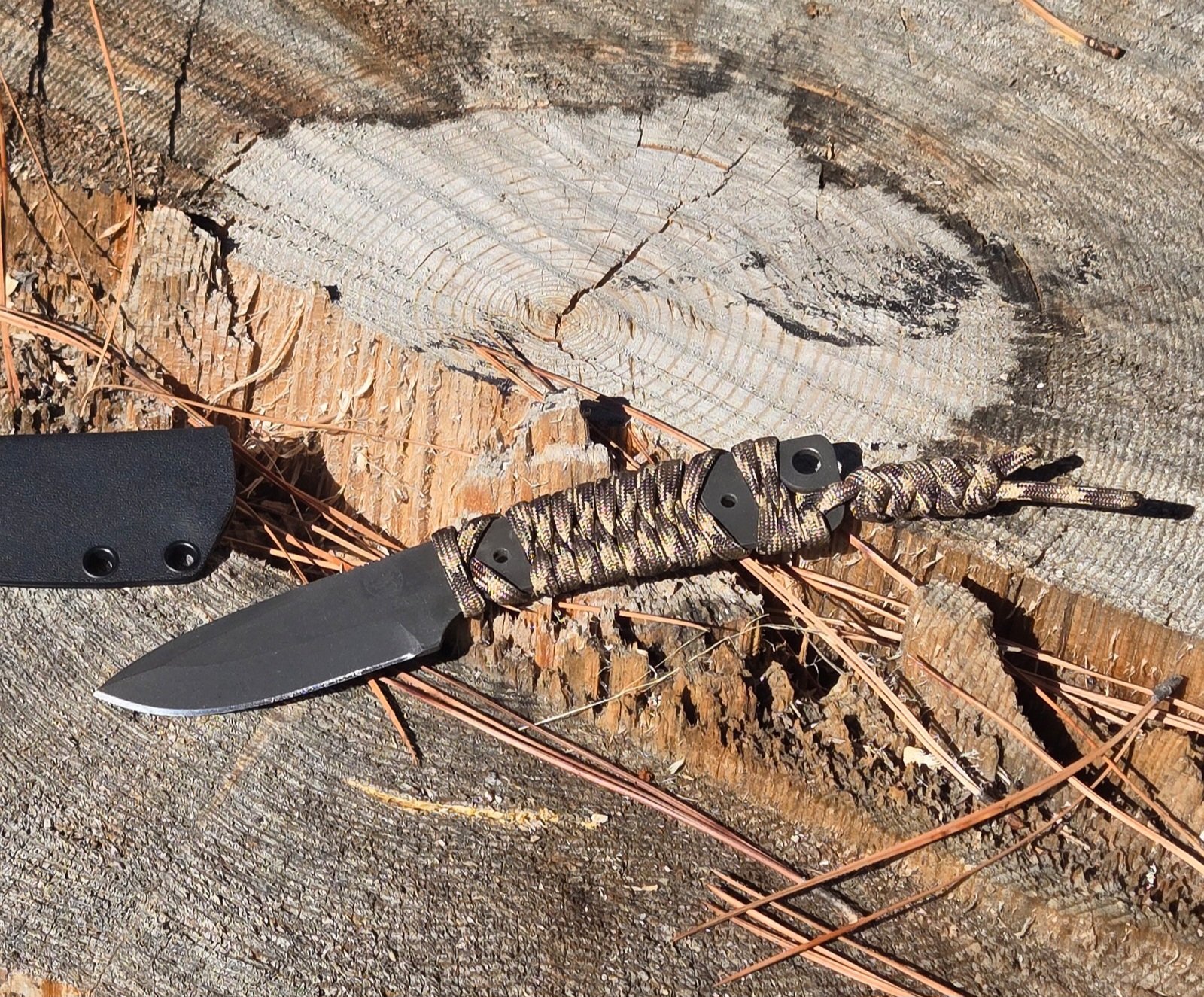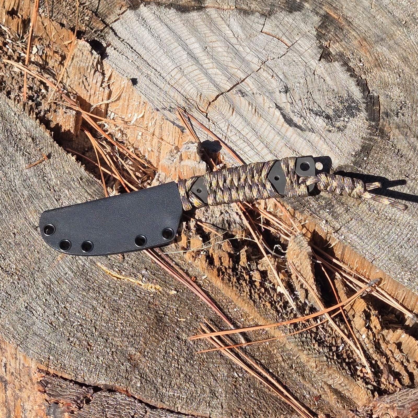 Cord wrapped Little Dude in AEB-L with an acid etched finish. Kydex sheath included.