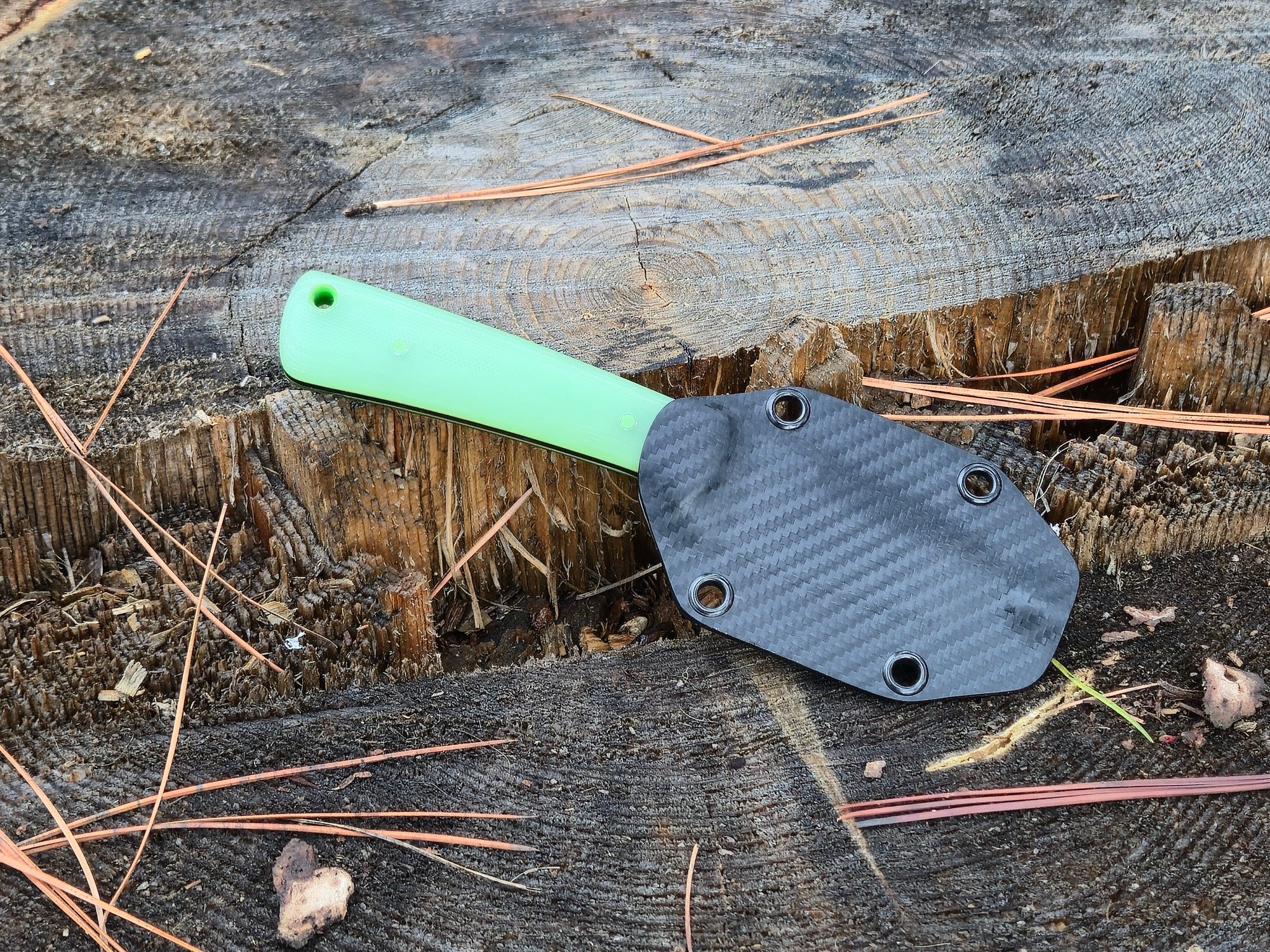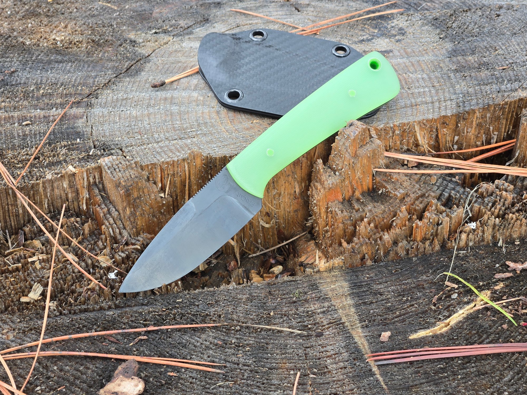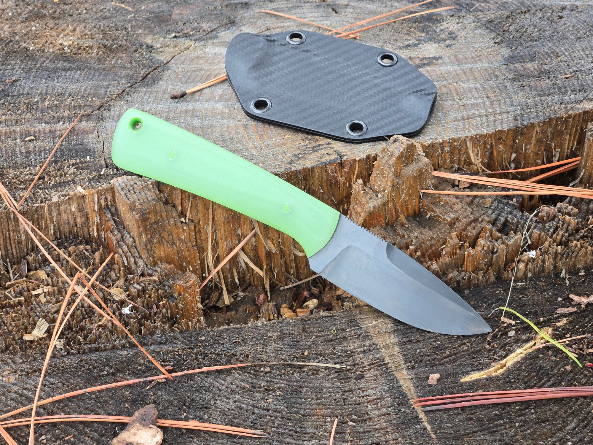 This Little Dude is made from Pop's ProCut hardened to 62 Rockwell C. The blade features a long false edge, a slightly more centered point, a flat ground primary bevel and a black oxide finish. The handle scales are jade G10 over toxic green G10 liners with toxic green G10 lanyard tube and pins.