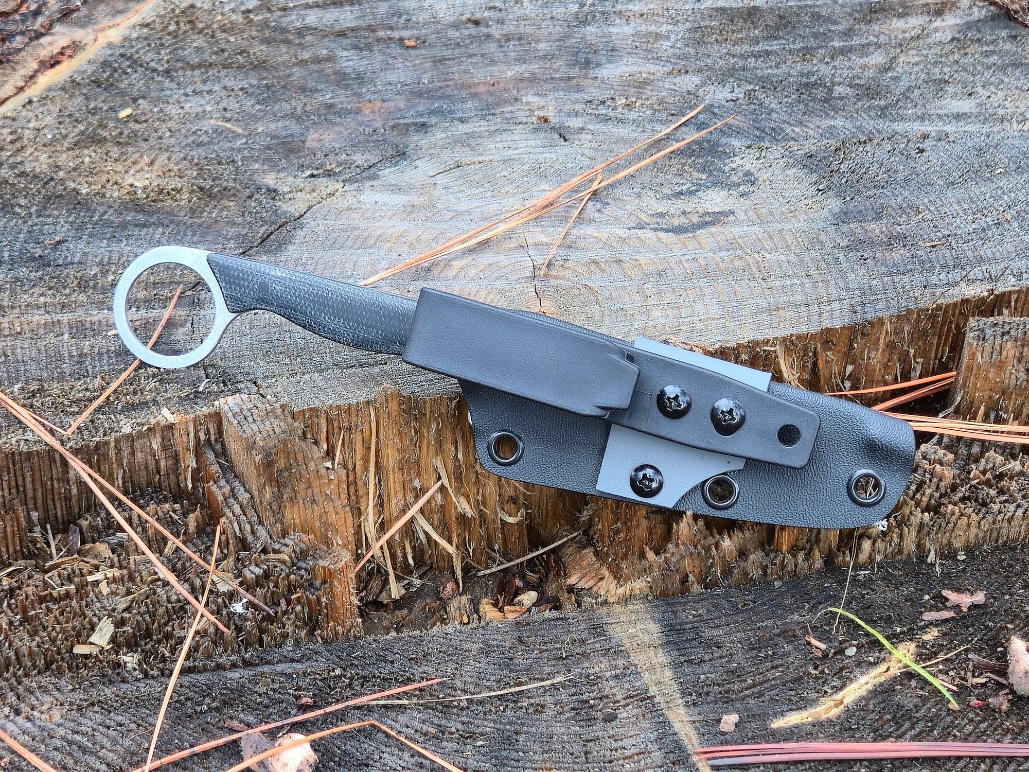 The sheath is black Kydex with a grey kydex pocket clip adapter.