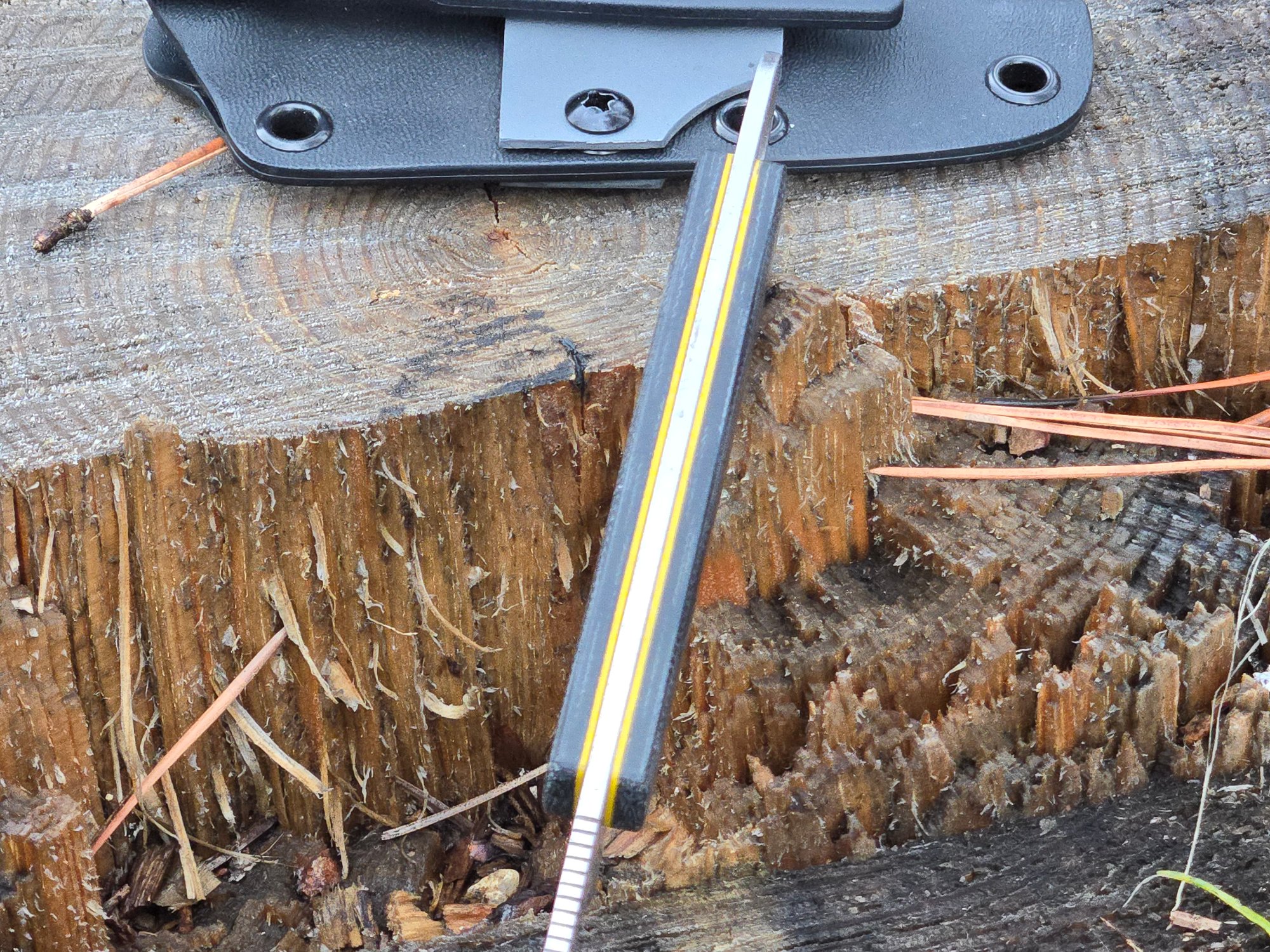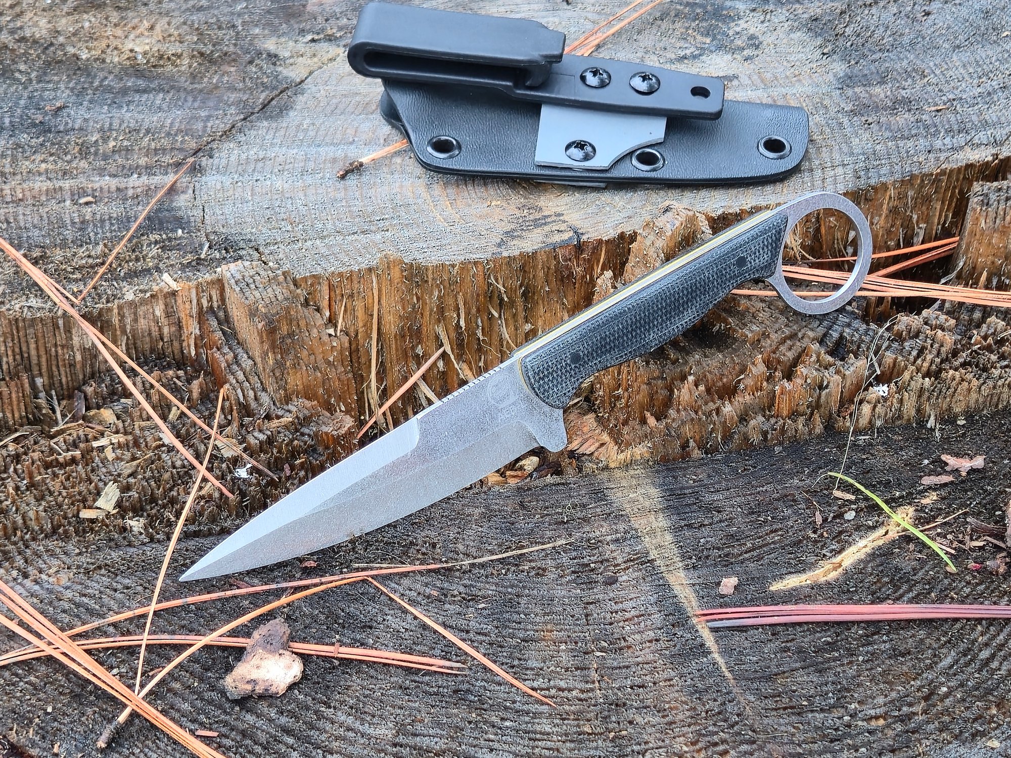 This Melee is made from AEB-L hardened to 60 Rockwell C. The blade features a stonewashed finish. The handle scales are black canvas micarta over yellow vulcanized liners with black G10 pins.